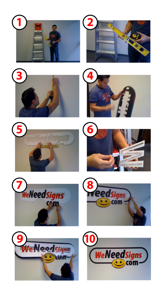 3. Placement: Measure the center of the wall or mark where you would like the center of you wall sign. Mark the height of where you would like the “Bottom of the sign”. The bottom of the sign shouldn’t be less than 5-1/2′ from the bottom of the floor, or shouldn’t crowd the ceiling.